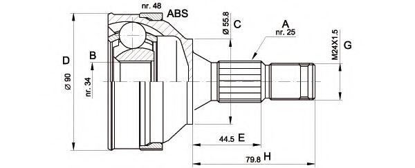Внешнее зацепление со стороны колеса : 25Внутренне зубчатое соединение со стороны колеса : 34Диаметр прокладки [мм] : 55,8Длина 2 [мм] : 44,5Наружный диаметр [мм] : 90Сторона установки : со стороны колесаТормозная динамика / динамика движения : для автомобилей с ABSЧисло зубцов кольца ABS : 48