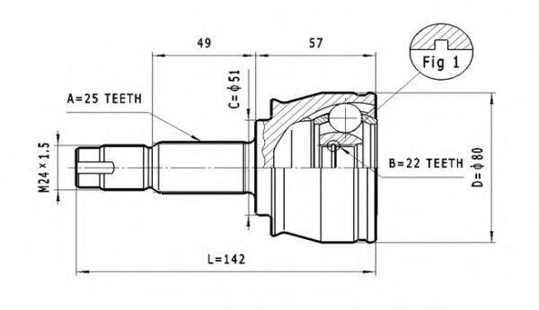 Внешнее зацепление со стороны колеса : 25Внутренне зубчатое соединение со стороны колеса : 22Диаметр [мм] : 79Диаметр прокладки [мм] : 51Наружная резьба [мм] : M24X1.5Сторона установки : со стороны колесаТип соединения / сочленения : Шарнир равных угловых скоростей