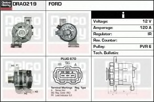 Дополнительный артикул / Дополнительная информация : с встроенным регуляторомИдентификационный номер исполнения штекерного разъема : PLUG670Количество ребер : 6Напряжение [В] : 12Ременной шкив : с ременным шкивом свободного ходаток зарядки от генератора (А) : 120