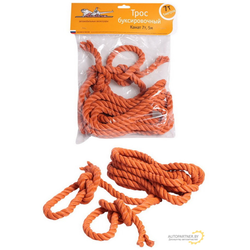 Буксировочный трос в форме каната оранжевого цвета изготовлен для транспортировки легковых машин и другой малогабаритной техники. Максимальная нагрузка на трос не должна превышать 7 тонн. Длина изделия составляет 5 метров. Трос крюками не комплектуется.