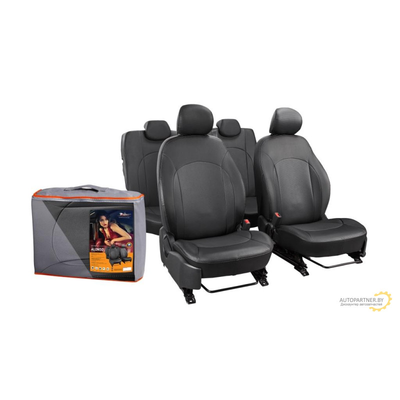 Чехлы изготовлены по бокам и сзади из высококачественной гладкой экокожи, в центральной части используется экокожа триплированная поролоном с перфорацией. На спинках передних сидений расположены вместительные карманы на молнии. Передние чехлы имеют специальный крой не мешающий открытию подушек безопасности. _x000D_