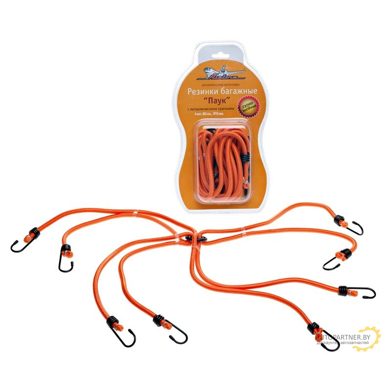 Купить автозапчасти в Гомеле, моторное масло купить, дешево купить. Резинки-стяжки набор AIRLINE Паук 4шт.-80 см, D-8 мм (металлические крючки) / AS-R-05