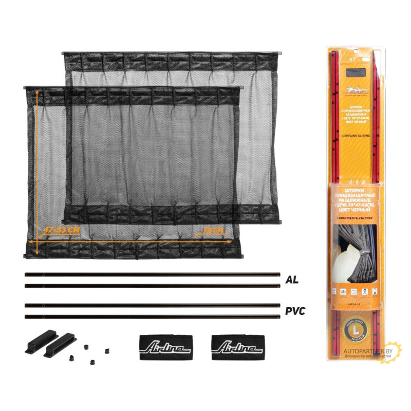 Купить автозапчасти в Гомеле, моторное масло купить, дешево купить. Шторки солнцезащитные раздвижные L (Д*В: 70*47-53см), цвет черный AIRLINE / ASPS-S-13