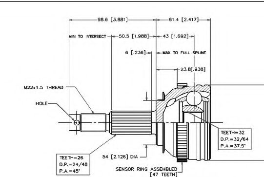 Внешнее зацепление со стороны колеса : 26Внутренне зубчатое соединение со стороны колеса : 32Диаметр прокладки [мм] : 54Сторона установки : со стороны колесаТип соединения / сочленения : Шарнир равных угловых скоростейЧисло зубцов кольца ABS : 47