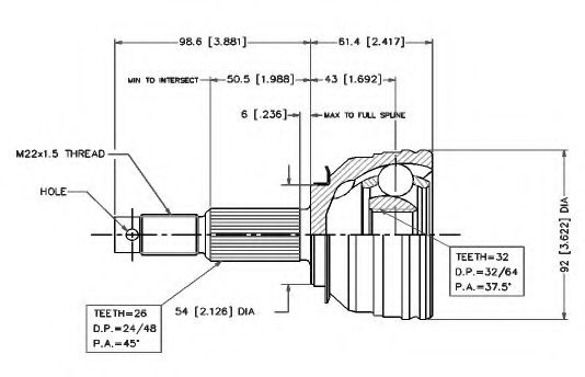 Внешнее зацепление со стороны колеса : 26Внутренне зубчатое соединение со стороны колеса : 32Диаметр прокладки [мм] : 54Сторона установки : со стороны колесаТип соединения / сочленения : Шарнир равных угловых скоростей