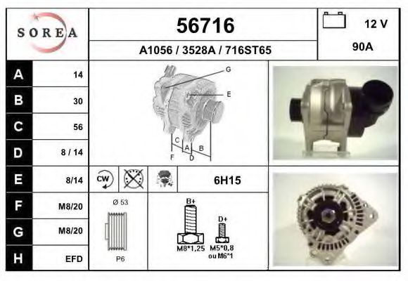 Ø шкива [мм] : 57 Клемма : M8 B+ Количество ребер : 6 Показать больше свойств