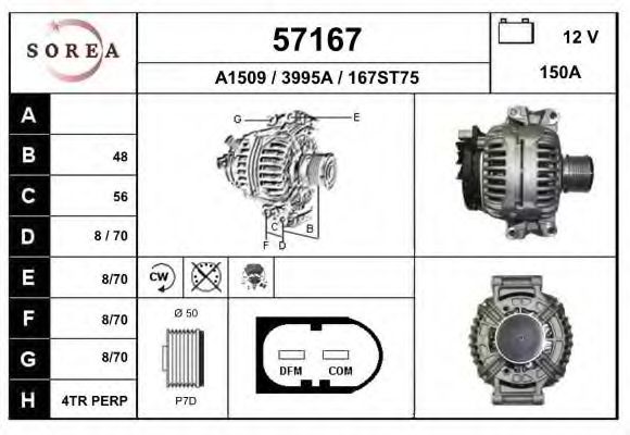 Клемма : M8 B+Количество ребер : 7Модель бортовой сети : для транспортного средства с 12В бортовой сетьюРеменной шкив : с ременным шкивом свободного ходаток зарядки от генератора (А) : 150