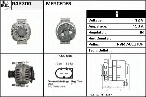 Дополнительный артикул / Дополнительная информация : с встроенным регуляторомИдентификационный номер исполнения штекерного разъема : PLUG649Количество ребер : 7Напряжение [В] : 12Ременной шкив : с ременным шкивом свободного ходаток зарядки от генератора (А) : 150