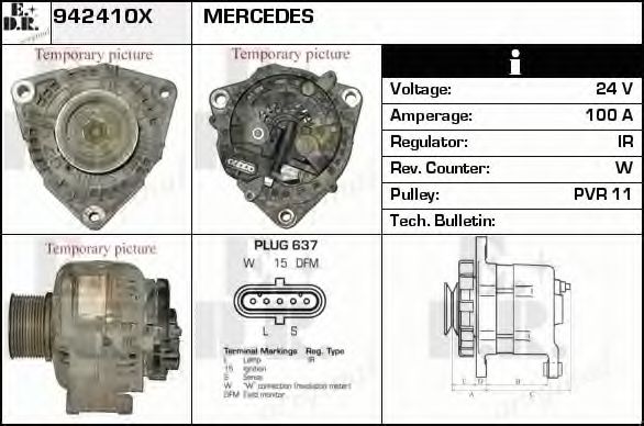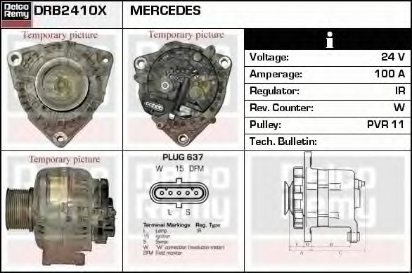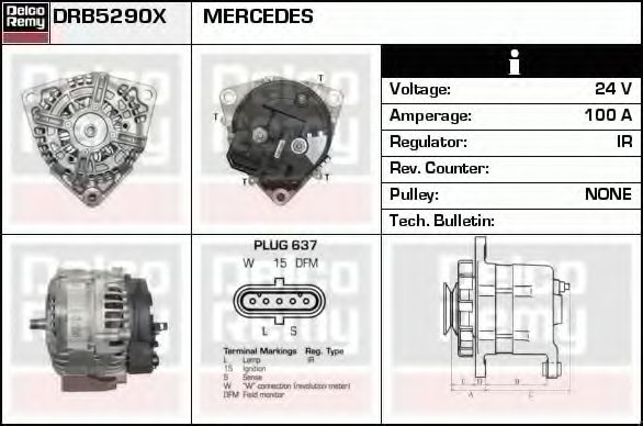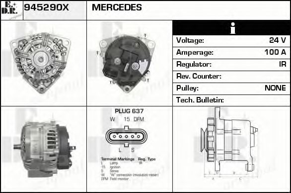 Дополнительный артикул / Дополнительная информация : с встроенным регуляторомИдентификационный номер исполнения штекерного разъема : PLUG637Напряжение [В] : 24Ременной шкив : без ремённого шкиваток зарядки от генератора (А) : 100