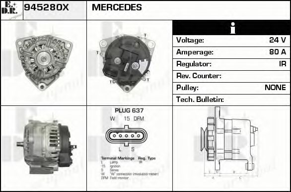 Дополнительный артикул / Дополнительная информация : с встроенным регуляторомИдентификационный номер исполнения штекерного разъема : PLUG637Напряжение [В] : 24Ременной шкив : без ремённого шкиваток зарядки от генератора (А) : 80