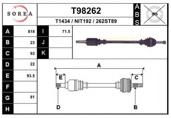 Внешнее зацепление со стороны дифференциала : 22Внешнее зацепление со стороны колеса : 23Диаметр 1 [мм] : 81диаметр 2 (мм) : 71,5Длина [мм] : 818Тормозная динамика / динамика движения : для автомобилей без ABS