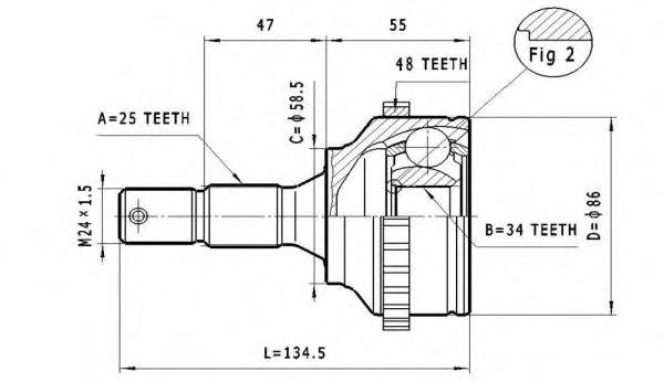 Внешнее зацепление со стороны колеса : 25Внутренне зубчатое соединение со стороны колеса : 34Диаметр прокладки [мм] : 58Длина [мм] : 134,5Сторона установки : со стороны колесаЧисло зубцов кольца ABS : 48