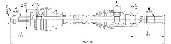 Внешнее зацепление со стороны колеса : 23Длина [мм] : 750Сторона установки : передний мост справаЧисло зубцов кольца ABS : 44Ширина (мм) : 9
