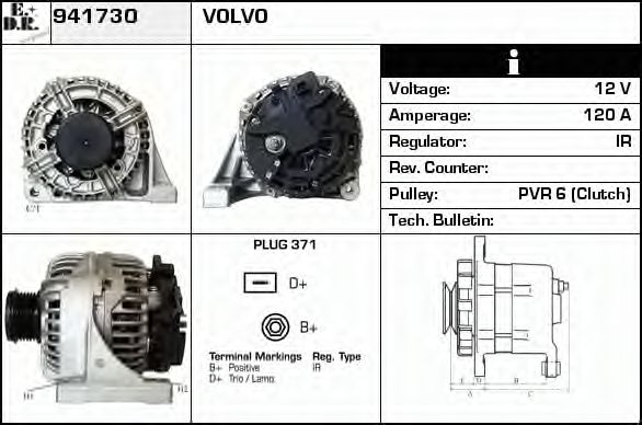 Дополнительный артикул / Дополнительная информация : с встроенным регуляторомИдентификационный номер исполнения штекерного разъема : PLUG371Количество ребер : 6Напряжение [В] : 12Ременной шкив : с ременным шкивом свободного ходаток зарядки от генератора (А) : 120