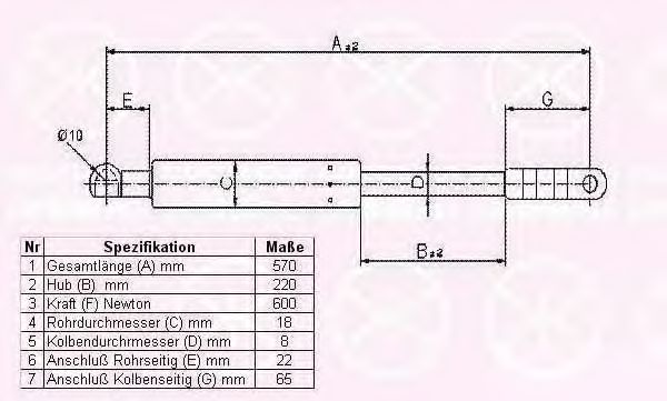 Высота подъема [мм] : 220 Выталкивающая сила [N] : 600 Общая длина [мм] : 570